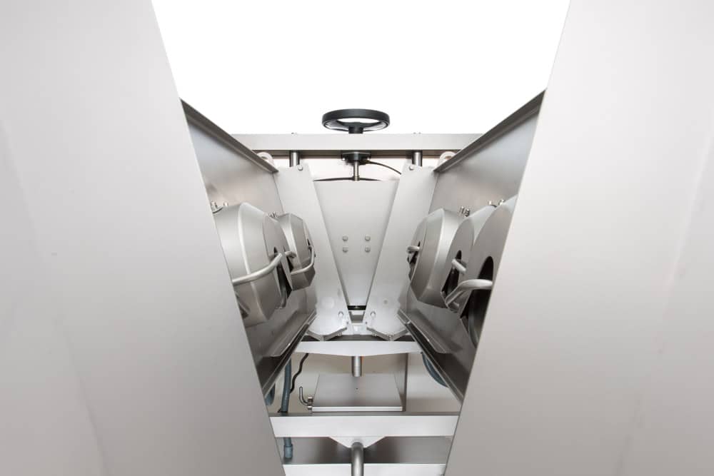 The discs are adjustable through the operating panel on the side of the hood. The output of product can be adjusted per disc by means of valves (one valve per disc). The hood is executed with sealed drives and backpressure valve. Front and back side of the hood can be removed without tools.
